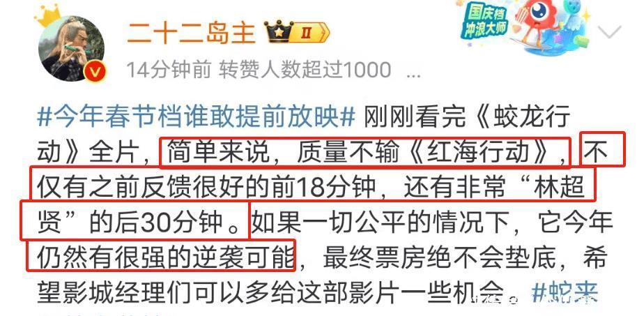 不外有一部电影很勇,即是《蛟龙行动》。之前,这部电影就一经邀请弘大电影东说念主不雅看了影片伊始的18分钟,其时就收成了一大波的好评,许多东说念主齐反映影片是开场即高燃!