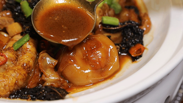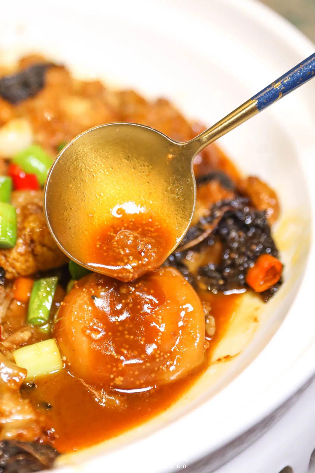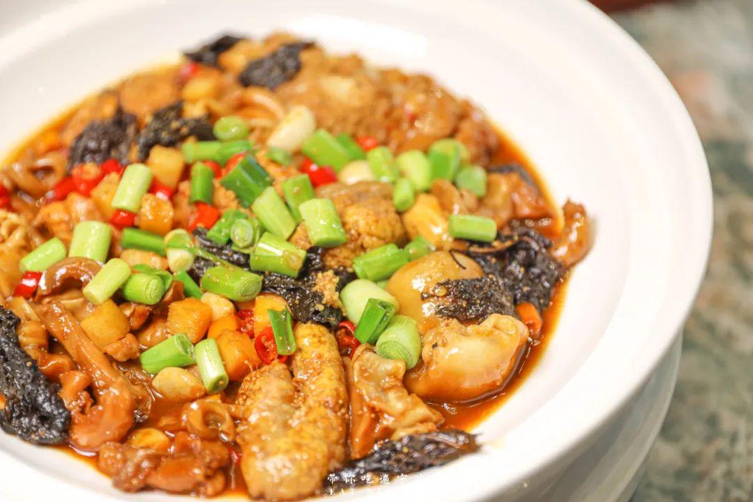 鲨鱼肚切成丝、黄鱼籽超大个头、仔鱼泡艮啾啾的,十足浸润在浓稠的汤汁里,进口齐是满满胶质感,这菜透顶下饭!