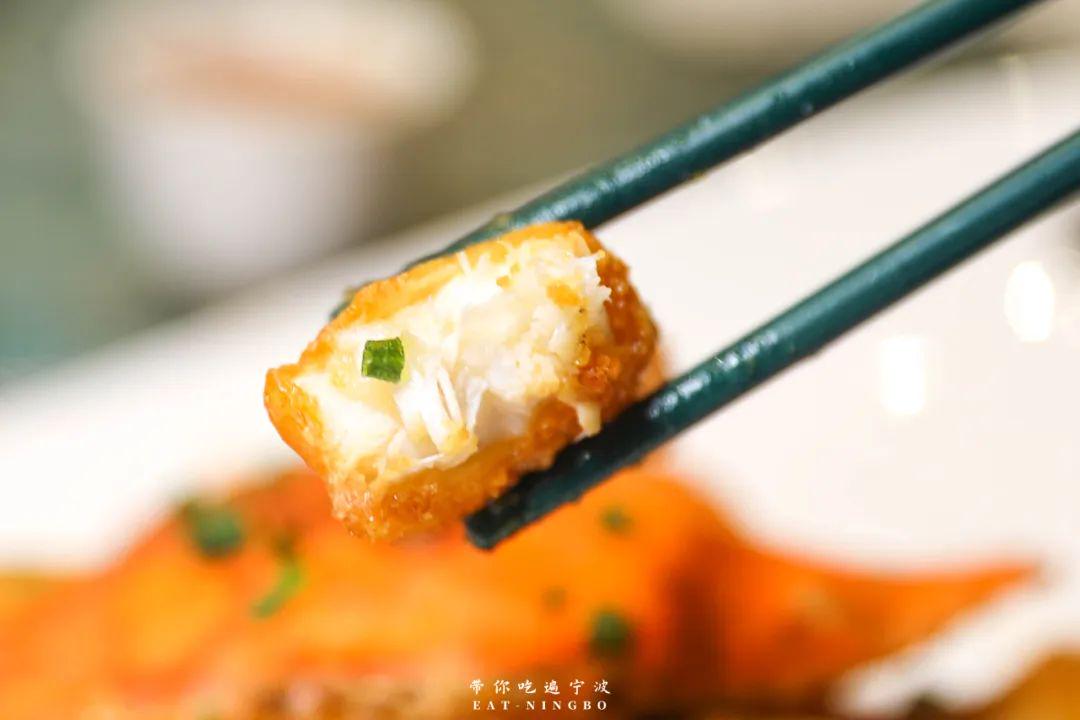 外壳被高温浸礼,炸至完全炸酥,焦脆外壳轻轻一掰酥皮便被扯开,还未进口,就闻到一股浅浅的海鲜味。