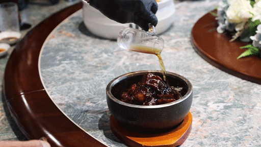 当作「东海宴」的本性头牌,精选上等和牛雪花,从食材泉源把控。将提前烧炙好的牛肉,放在鹅卵石上,倒上一圈酒,燃烧,火焰直冲而来。