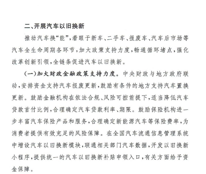 《激动蚀本品以旧换新行动决策》见知中提到开展汽车以旧换新,激动汽车换“能”,着眼于新车、二手车、报废车、汽车后阛阓等汽车全生命周期各门径,加大战略守旧力度,流畅轮回堵点,强化更正转换引颈,全链条促进汽车以旧换新。