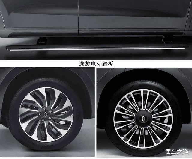 来到车身侧面,依旧是凯旋的车顶线条,高昂的车身概述,看上去极度敦厚。车身尺寸方面,长宽高区分为5020/1945/1760mm,轴距为2820mm。这次,新车将提供多款轮圈造型可选,已知的有轮胎规格区分为255/50 R20和265/45 R21,提供电动侧踏选装。