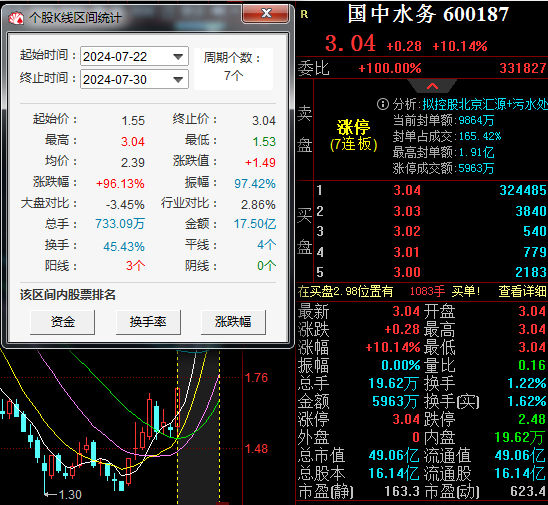 二级商场上,戒指当天收盘,国中水务录得7连板,累计涨幅达96.13%。