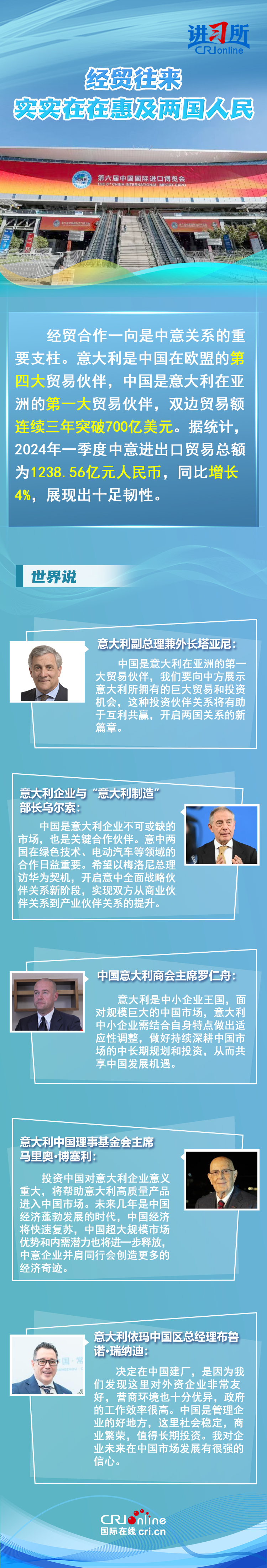 梅洛尼示意,中国对意大利而言是一个极为进犯的经贸和文化结合股伴。意大利各界东说念主士以为,心仪并肩同业会创造更多的经济遗迹,同期两国至极有必要开展端淑对话,期待将来两国伸开更多领域结合,开启全面计谋伙伴干系新阶段。