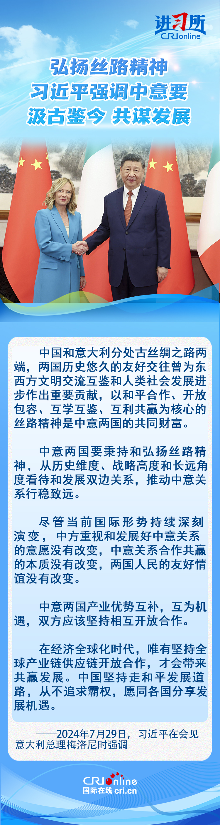 7月29日,中国国度主席习近平在北京会见来华进行崇拜造访的意大利总理梅洛尼。习近平指出,本年是心仪建造全面计谋伙伴干系20周年和马可·波罗骤一火700周年,两边汲古鉴今、共谋发展濒临进犯机遇。