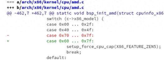 AMD Linux 代码一直将 Zen 5 视为 1Ah 系列搞定器,其型号 ID 在 0x00 至 0x2f、0x40 至 0x4f 和 0x70 至 0x7f 之间。但事实阐发注解,公认的 Zen 5 型号应该是 0x60 至 0x7f...因此刻下的 Linux 内核(型号 96 至 111)莫得涵盖 0x60 至 0x6F 型号范畴。