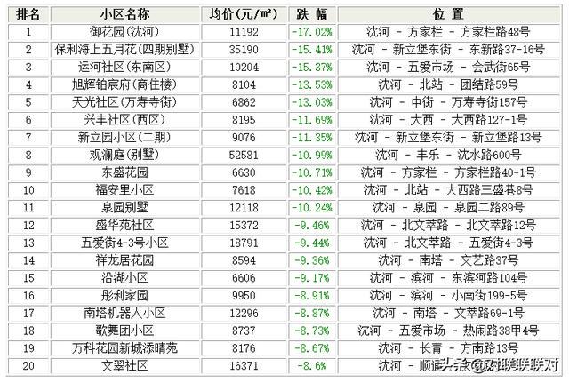 沈阳沈河二手房本月跌幅最大的小区名次