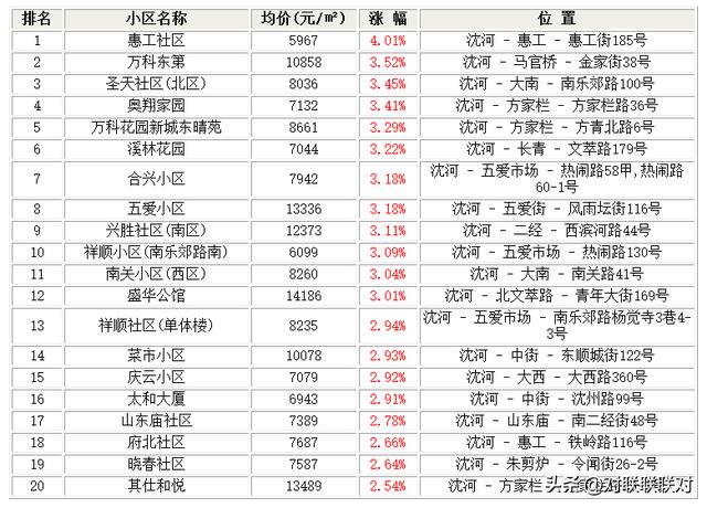 沈阳沈河二手房本月涨幅最大的小区名次