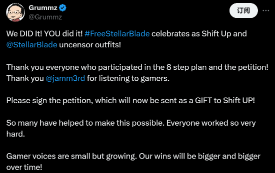 看成#FreeStellarBlade示威举止率先的发起者,推主Grummz发文庆祝了这场浮现取得的权贵恶果:“咱们作念到了!他们取消了服装审查。感谢悉数参与示威举止的东谈主,好多东谈主齐为杀青这一指标作念出了孝顺。每个东谈主齐相配竭力,也感谢金亨泰大约倾听玩家心声。请继续签署示威书,它将看成礼物发送给Shift UP。玩家的声息天然很小,却在束缚壮大。随来源艺的推移,咱们的奏效将越来越大。”