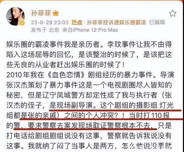其后左证孙菲菲的爆料称,同庚年底,在辽宁凤凰山片场,她和助理不才山途中忽然被三名剧组男性压倒在地。 其中导演助理杨兆华朝她吐涎水、批颊、暴打;制片姚远更是顺利将她推倒、连踹数脚。