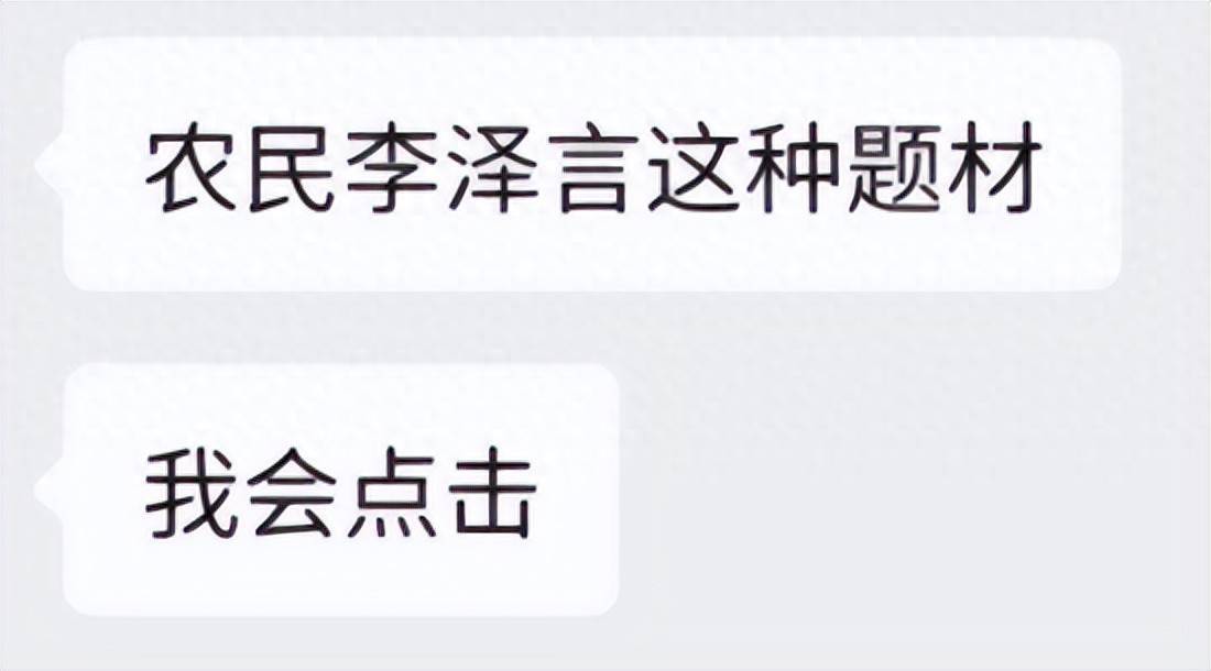 前阵子我和一又友聊天的本事,她说:“淌若有农民李泽言这种题材,我会点击。”