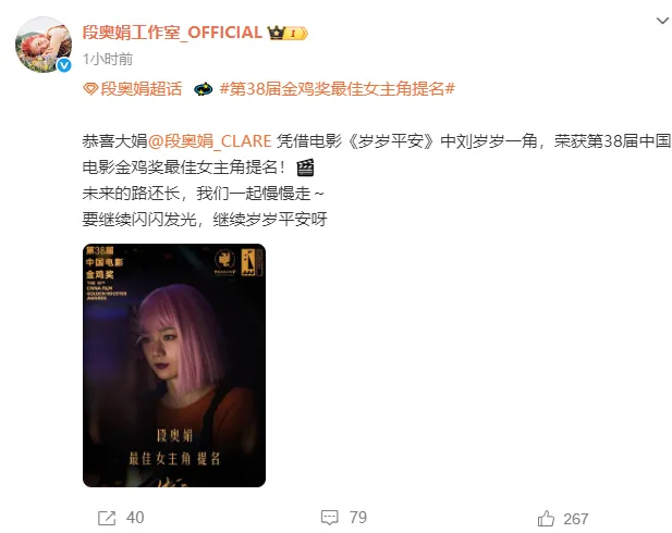段奥娟使命室发文祝愿:恭喜大娟凭借电影《岁岁吉利》中刘岁岁一角,荣获第38届中国电影金鸡奖最好女主角提名!将来的路还长,咱们一说念渐渐走~要络续闪闪发光,络续岁岁吉利呀。