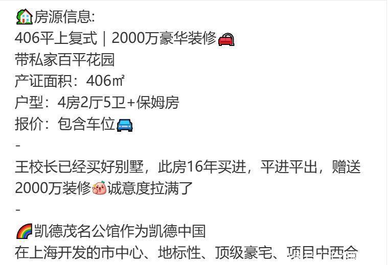 王想聪购买的这套豪宅位于上海富东谈主区的凯德茂名公馆,早在本年7月份时,这套豪宅就仍是被放到网上挂牌出售,当先的价钱向上1亿,自后又降到了8500万,可迟迟都莫得卖出去,王想聪当初买下这套豪宅时,花消好像6500万,听说又加装了2000万的装修费,是以举座的价钱向上8000万,但这次不知出于什么原因,应承失掉也急于出售