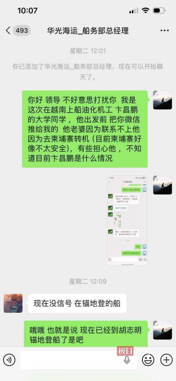 丁女士告诉极目新闻记者,她丈夫卞昌鹏是江苏邳州东说念主,大学毕业于江苏海事学院。2025年11月底,丈夫跑完一回三个月的内河航运后回了故乡,因为家庭经济压力较大,念念趁着年底远洋船下船的船员多、契机多,于是丈夫拜托作念船务中介的大学同学,把简历挂到了船员招聘网站上。