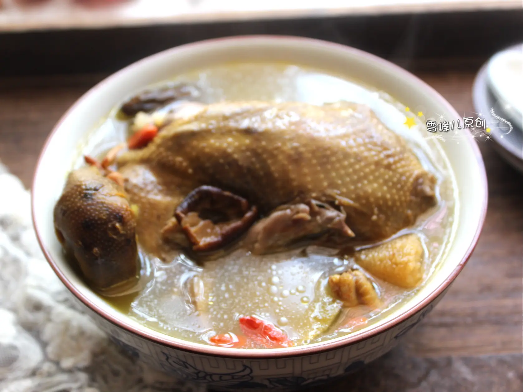 【红枣鸽子汤】食材:鸽子1只,香菇少量,茯苓,虫草花,竹荪,麦冬,玉竹,黄芪,香菇,红枣,盐少量。