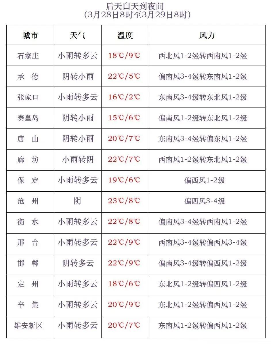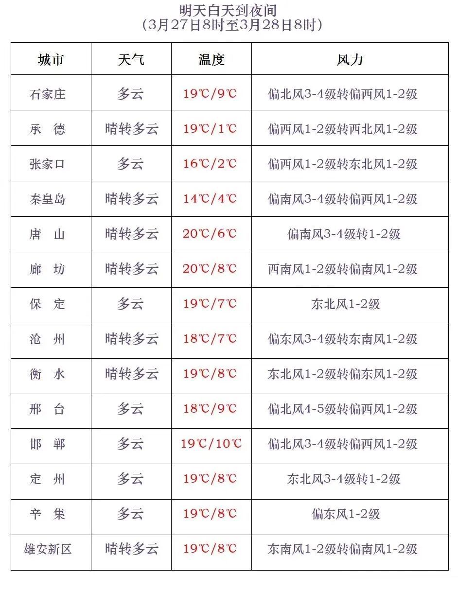 改日三天天气预告河北省景色台2026年3月26日11时发布天气预告:降水:今天地午到夜间,保定、廊坊以北地区多云放晴,其他地区晴间多云。今明两天,天气干燥,请隆重防火!来日白日,全省晴转多云。来昼夜间到28日,坝上地区多云转阴有小雨或雨夹雪,唐山、秦皇岛多云间阴,其他地区多云转阴有小雨或雷阵雨。28昼夜间到29日,北部地区和东部地区阴有小雨或雷阵雨转多云,其中坝上地区阴有小雨或雨夹雪转多云,其他地区多云放晴。降温:27-28日清晨,全省大部分地区最低气温下落3~6℃。大风:28日白日,南部地区有偏南风4到5级,阵风6到7级。29日白日,北部地区有西北风4到6级,阵风7到8级。城市预告
