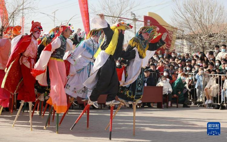 1月29日,在河北省沧县旧州镇贾村,风气艺东谈主在饰演踩高跷。