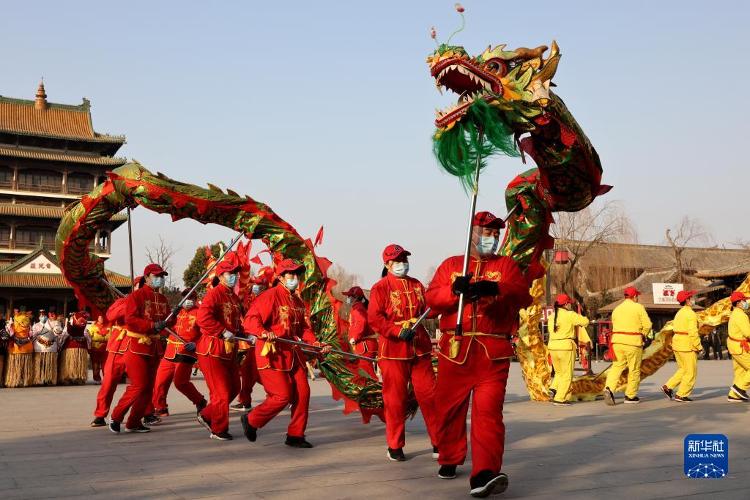 1月30日,在山东省枣庄市台儿庄古城,民间艺东谈主在饰演舞龙。