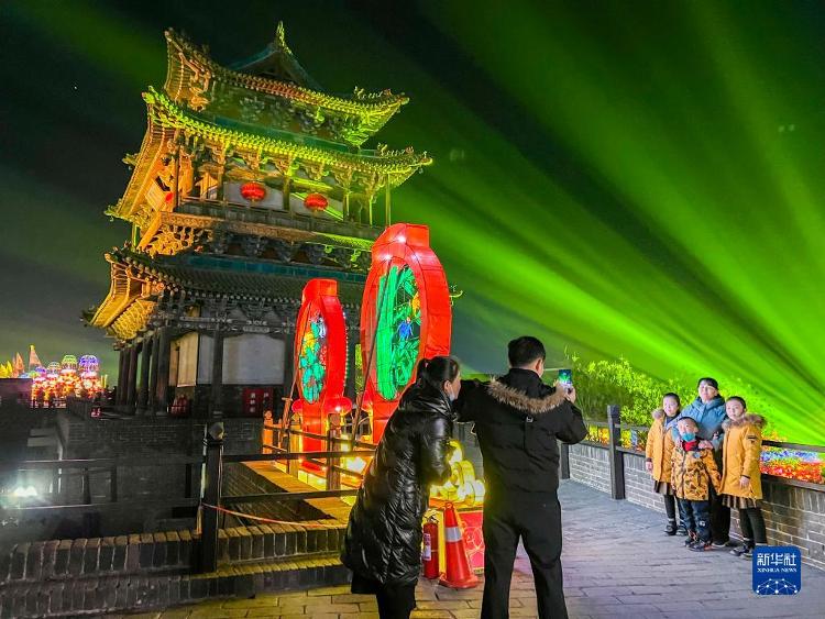 1月29日,旅客在山西省晋中市平遥古城的灯光秀前拍照贪恋。