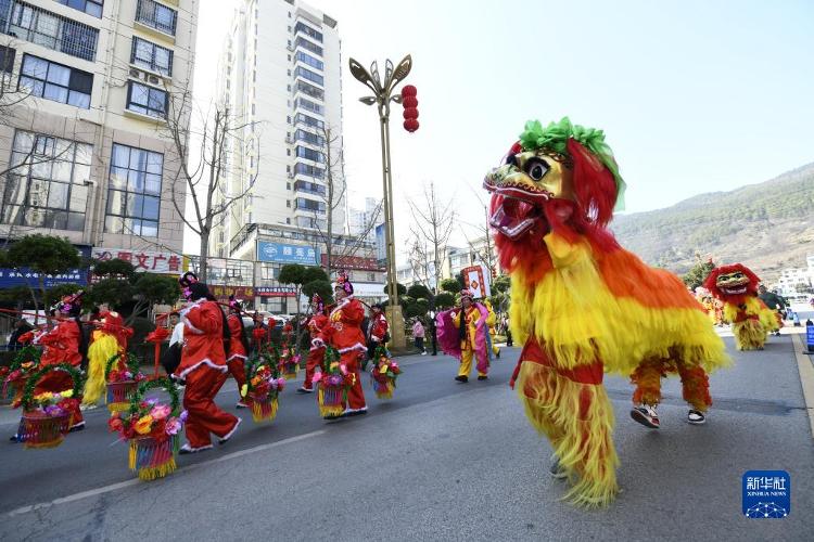 1月30日,在贵州省黄平县新州镇,舞狮队在街头巡游。