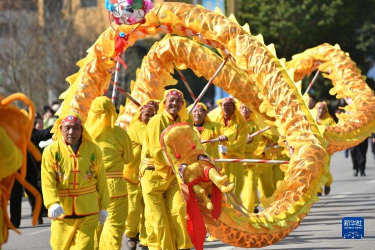 1月30日,在贵州省黄平县新州镇,舞龙队在街头巡游。