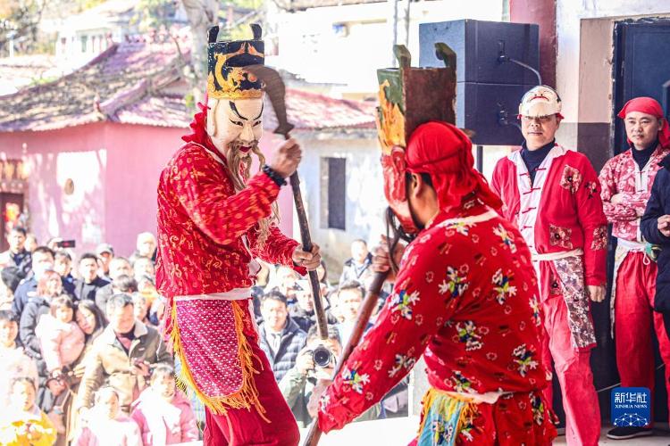 1月29日,在江西省抚州市南丰县莱溪乡黄满村,傩舞艺东谈主在饰演傩舞。