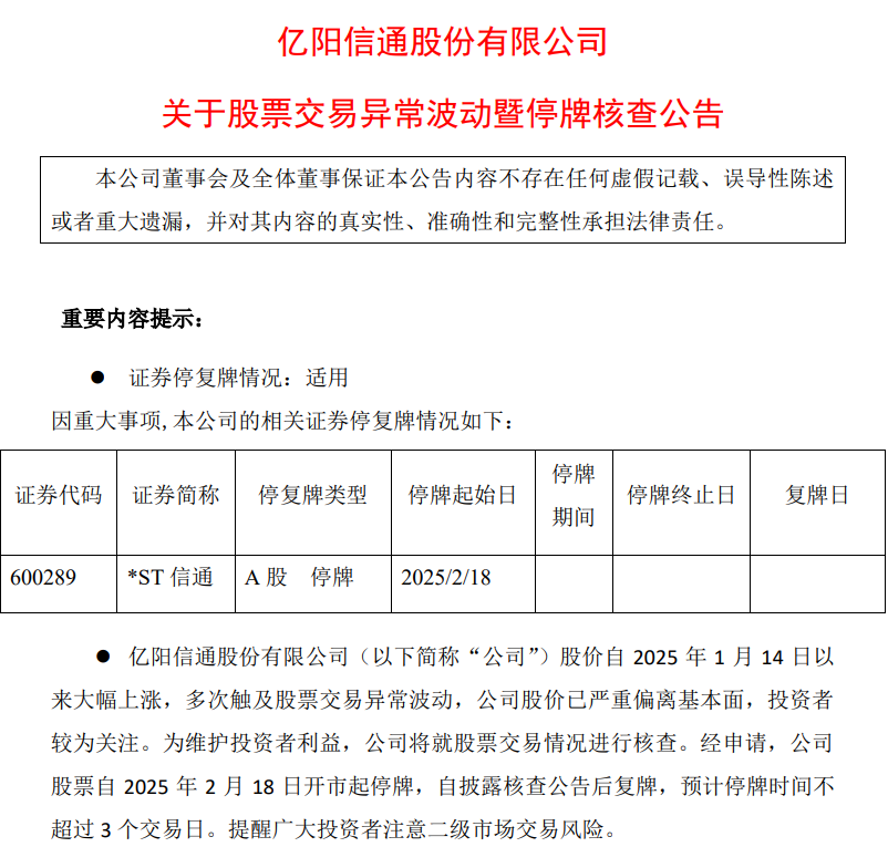 2月17日,*ST信通(600289.SH)发布股票来回风险教唆公告称,自2025年1月14日以来,公司股价大幅高涨,屡次波及股票来回至极波动,已严重偏离基本面。经苦求,公司股票自2025年2月18日开市起停牌,自线路核查公告后复牌,瞻望停牌时候不逾越3个往异日。
