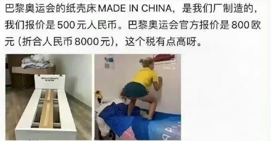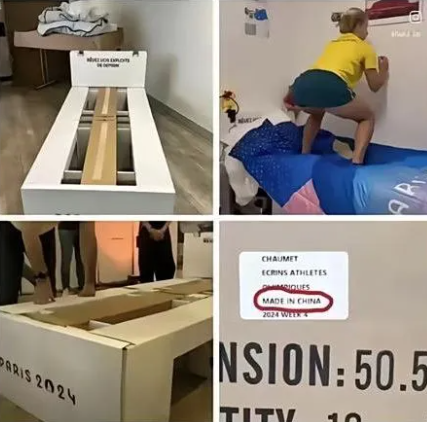 不外,巴黎奥运会前夜,有眼尖的网友发现,在巴黎奥运村纸壳床的包装上,果然印有“Made in China”的字样。