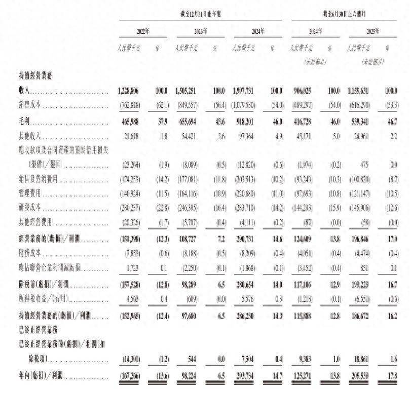 招股书表露,锐明时代2022年、2023年、2024年营收离别为12.29亿元、15亿元、19.98亿元;毛利离别为4.66亿元、6.56亿元、9.18亿元;毛利率离别为37.9%、43.6%、46%;期内利润离别为-1.67亿元、9822万元、2.94亿元;期内利润率离别为-13.6%、6.5%、14.7%。